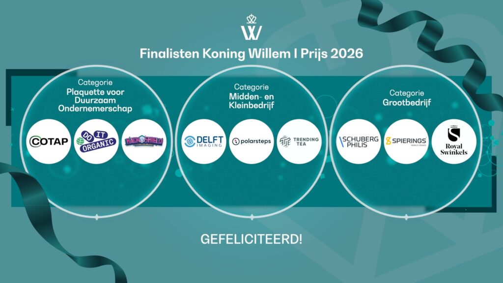 Na een intensief traject van pitches en beoordeling door de vakjury’s zijn de finalisten voor de Koning Willem I Prijs 2026 bekend. Deze ondernemingen onderscheiden zich door hun durf, daadkracht en toekomstgerichte visie en laten zien hoe ondernemerschap bijdraagt aan de vooruitgang van Nederland.